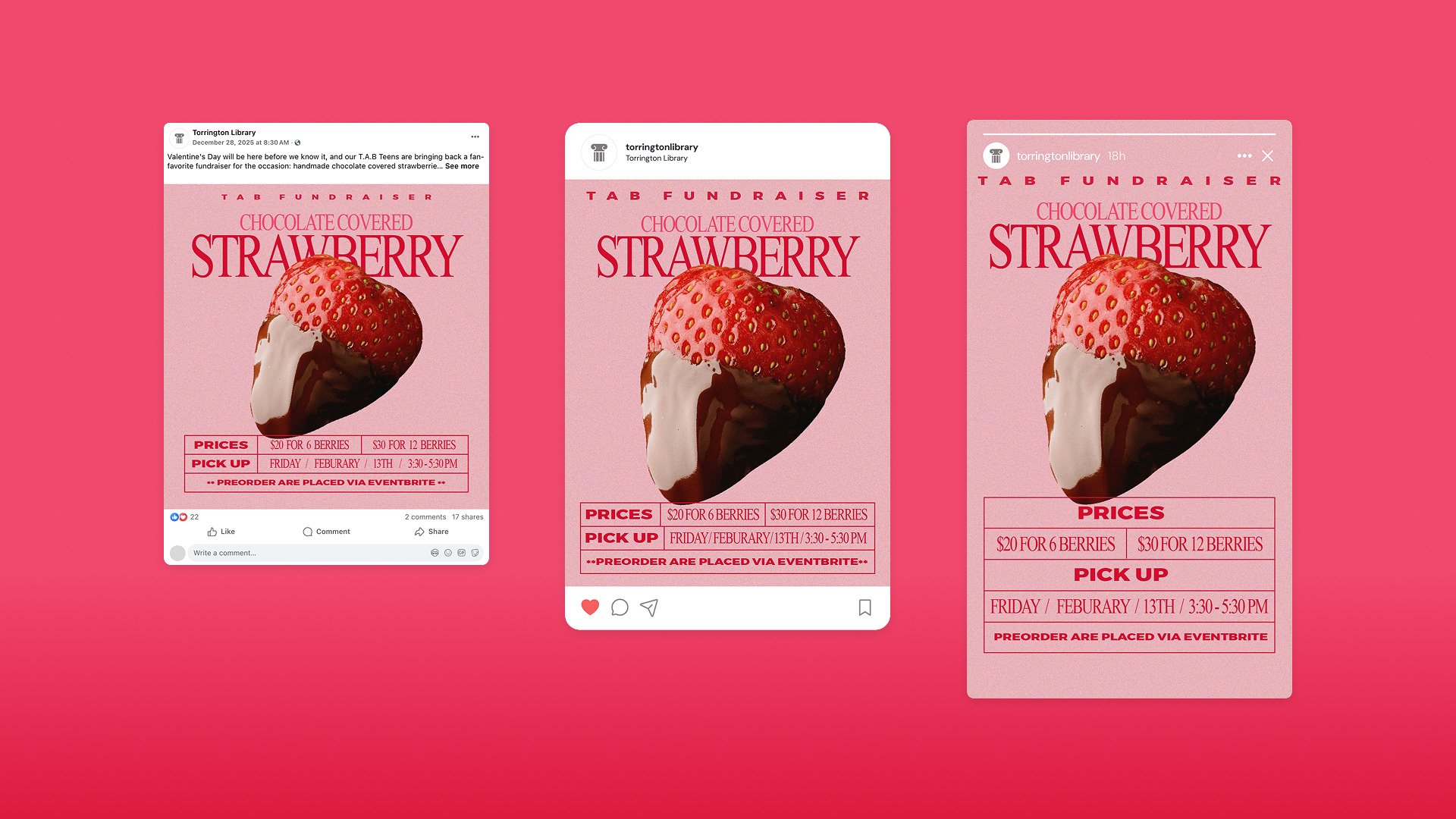 This concept project was created for a local library’s fundraising event featuring handmade chocolate-dipped strawberries for Valentine’s Day. The poster’s key visual was designed around a large, appetizing strawberry to immediately capture attention and convey the indulgent, celebratory mood of the event. A color palette inspired by fresh strawberries and soft pink tones associated with love was used, paired with a subtle vintage aesthetic to create a warm and nostalgic feel. The design was also adapted into multiple size variations for social media posts to ensure visual consistency across platforms.